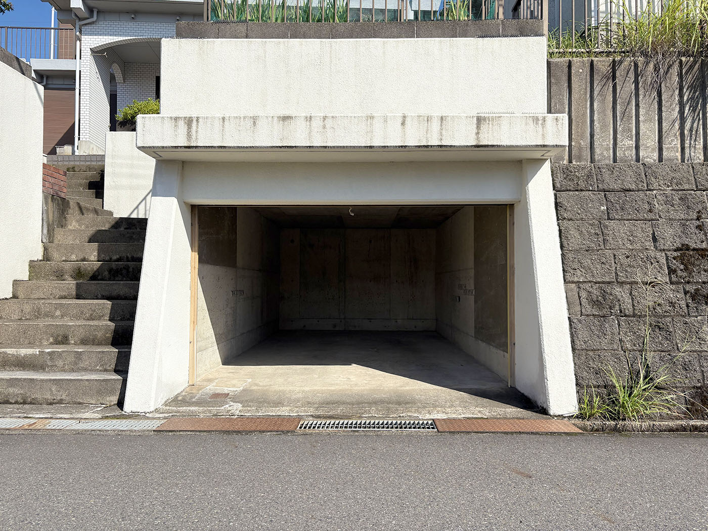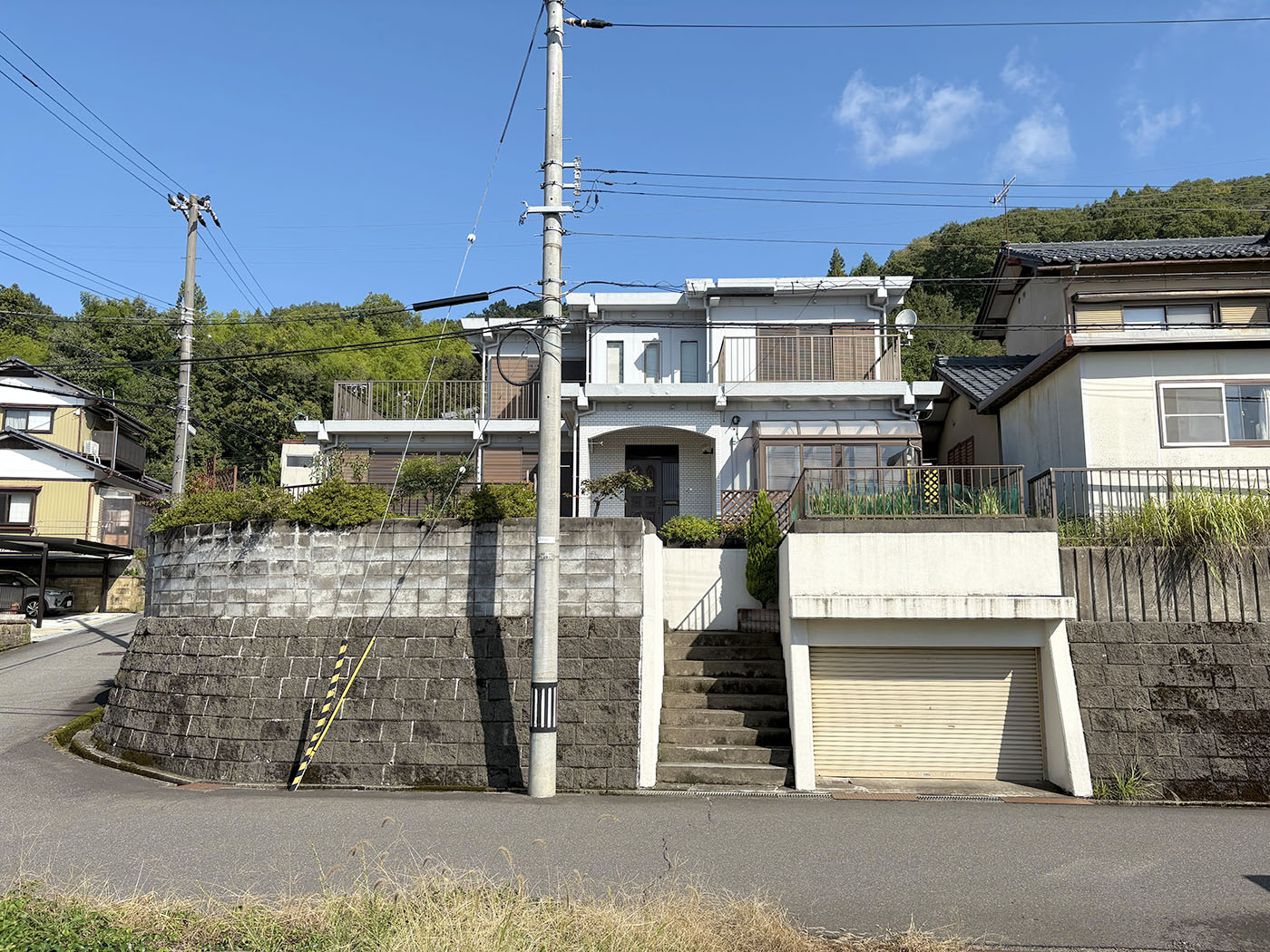 通りから見上げた擁壁に囲まれた高台の白い家は、下からでは全容が見えない。
