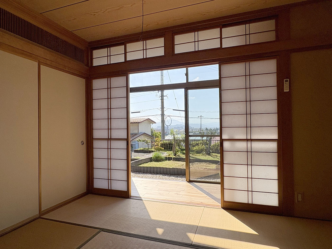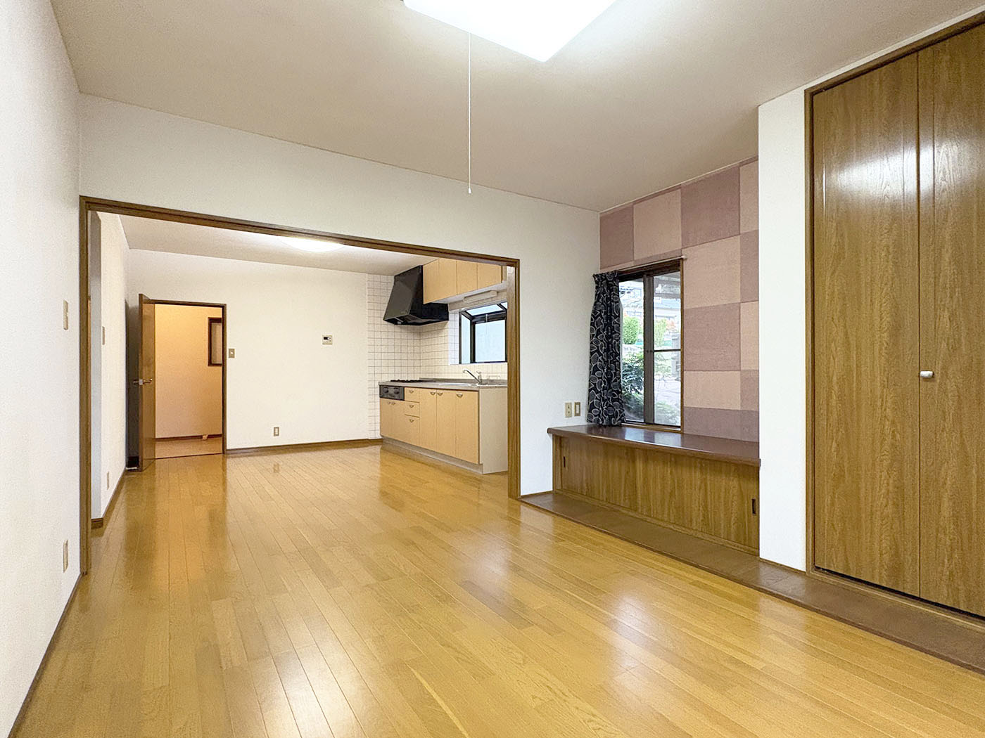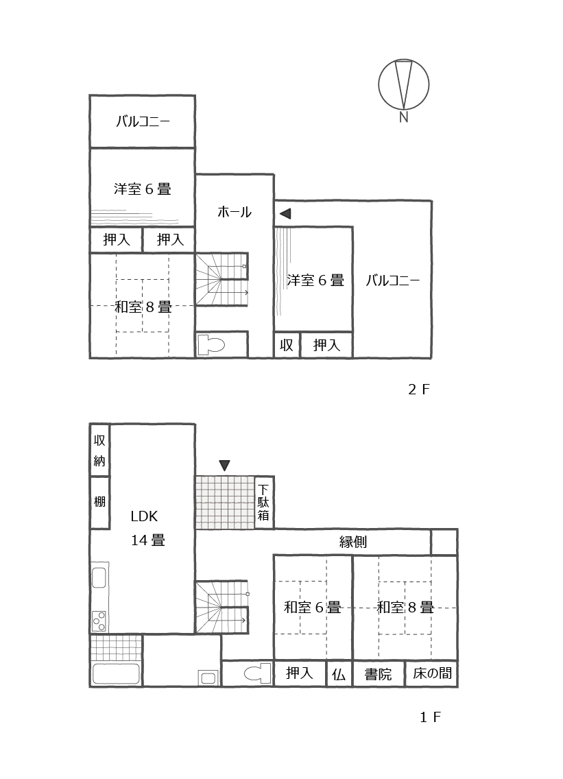 1階は14畳の広いLDKと水回り、日当たりの良い縁側に沿った和室2間。