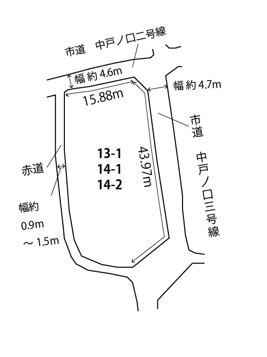 | 間口・道路 | 北向き 約4.6mの公道に15.8m接面 東向き 約4.7mの公道に43.9m接面 ※西側・南側に赤道あり |